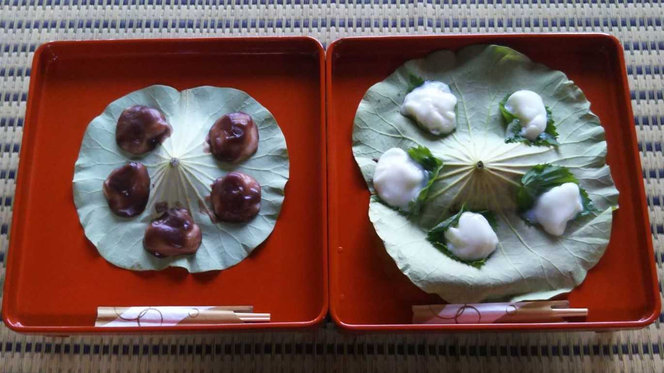 - 1つの膳にはあんをのせ、もう1つの膳はそのままにする (餅の分だけさい箸をつける家庭もある)。