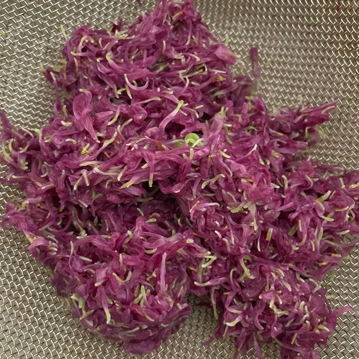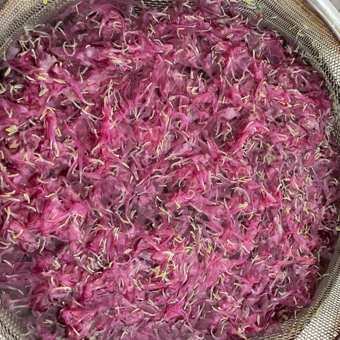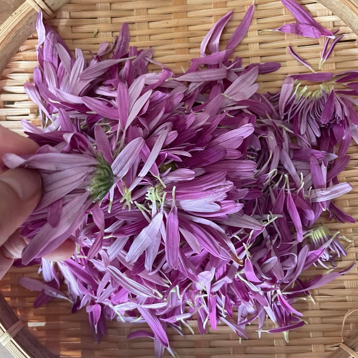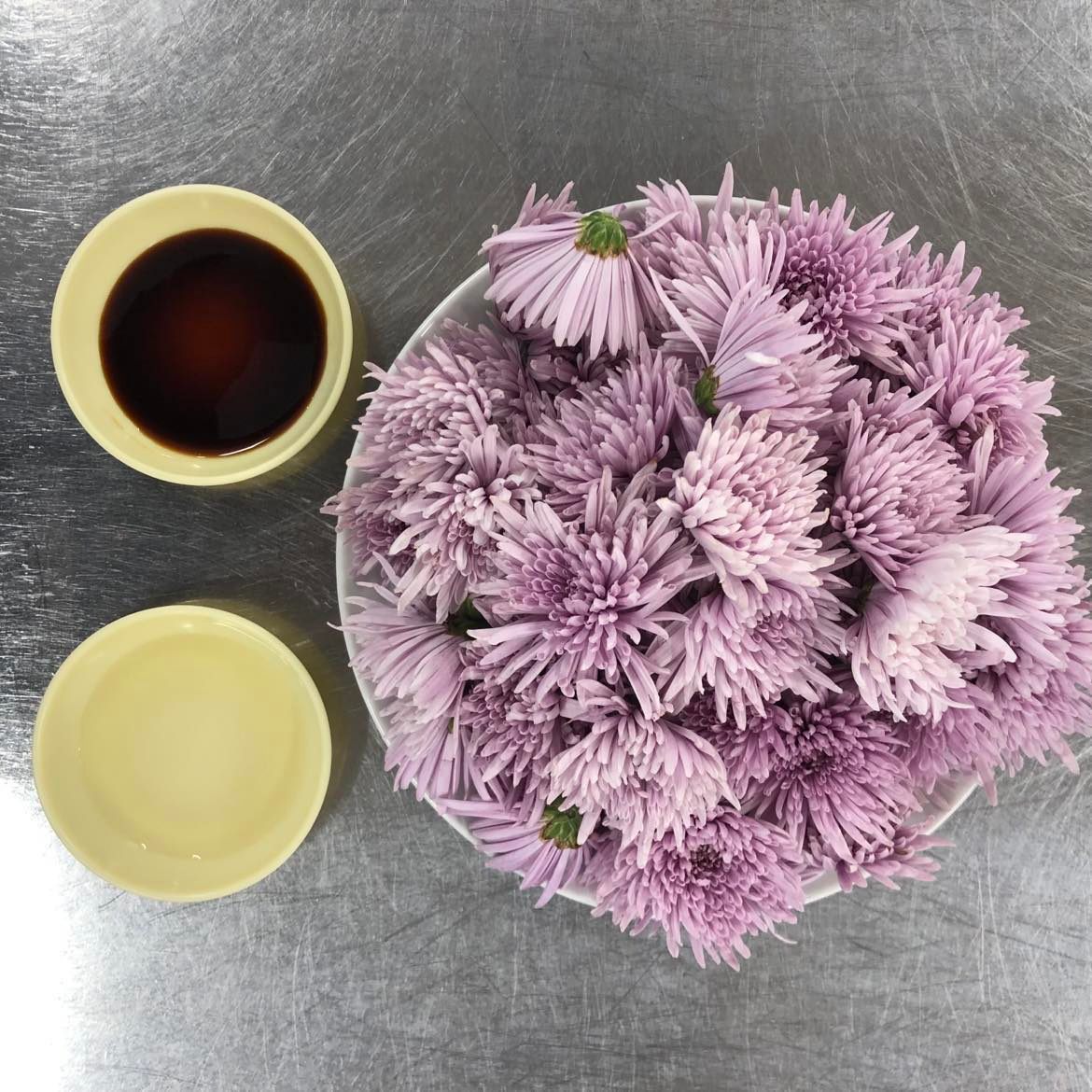 - 菊の花はへたを取り、よく水洗いしザルにあげて水気をきる。
