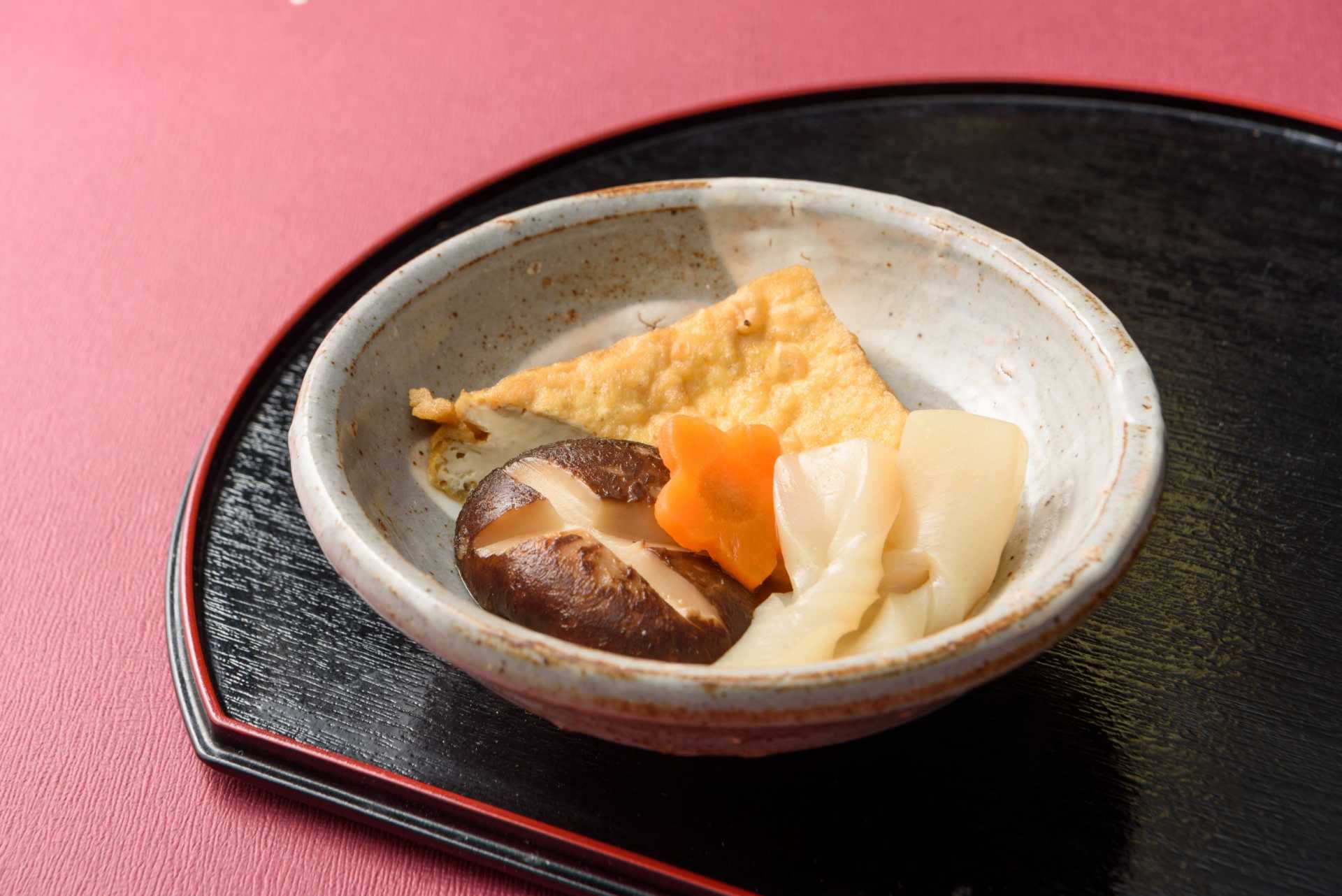 - Aを煮立て、干ししいたけとこんにゃくを入れ、味がしみたら油揚げを加え、落としぶたをして煮る。