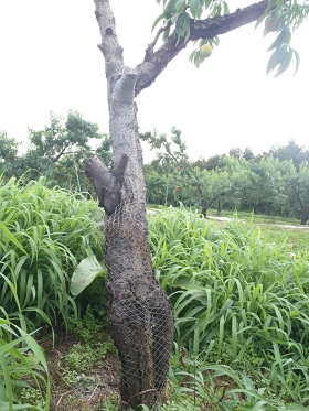 下の写真は、ネズミ除けのネットを幹に巻きつけた桃の様子。