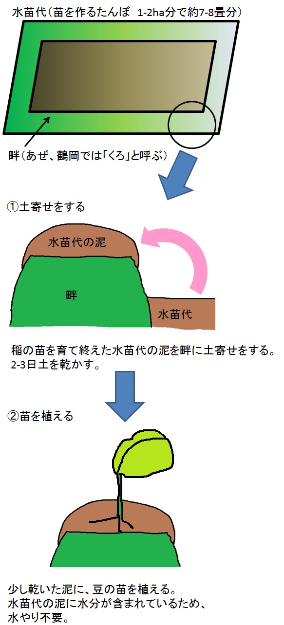 昔は水苗代と呼ばれる苗を植えるたんぼの畔(あぜ)にこの黒豆を植えていました。
