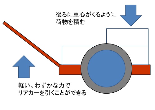 右の図のように荷物の重心を後ろにずらすことがポイント。