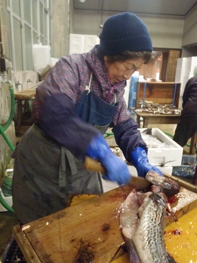 冷え込む市場の中で冷水を使い、骨の固いスケソウダラの頭を切り落としていきます。