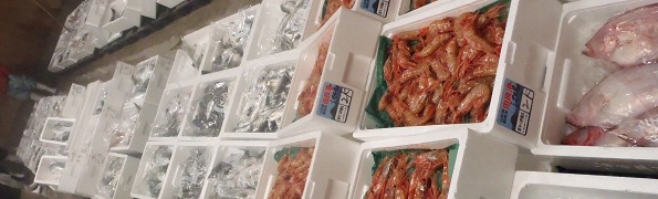 市場には、今日獲れたばかりの魚が所狭しと置かれていましたが、この日は天候が悪く、お昼近くまでの漁だったため、これでも魚は少ないそうです。