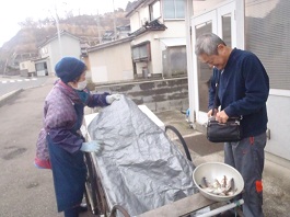 倉子さんは、大きくて形の良いハタハタを見せ、大黒様(のお歳夜)にどお?12月に入ると卵が固くなるし、ハタハタも高くなるから今のうちに買って冷凍しておくといいよ。」と言いながら、魚を勧めていきます。