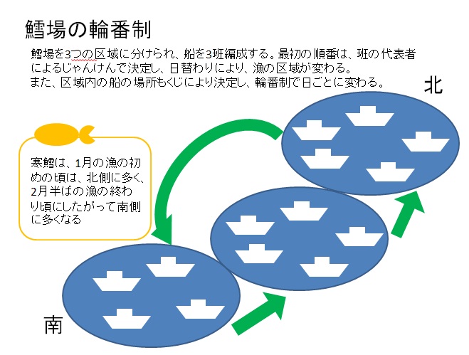 早い者勝ちで漁場を決めていくかと思いきや、鼠ヶ関では、寒鱈漁を行う14艘で取り決めをし、3班編成で漁の場を輪番制にしているそうです。
