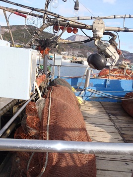 気候や海の状態がよいと午前4時から午後4時まで12時間海に出ています。漁場までの行き帰りに4時間。漁場では底引き網を7-8回仕掛け、漁をします。