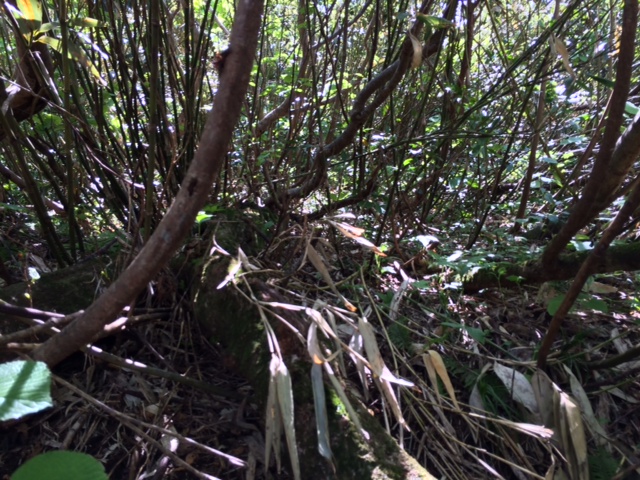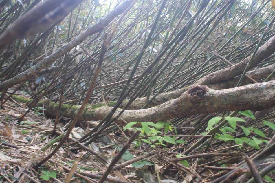 8合目から、歩き始めて1時間半程で佐藤さんの採り場に到着しました。前編では佐藤さんの筍畑を訪れましたが、その笹薮よりさらに背の高い、3〜4メートルはある笹薮です。