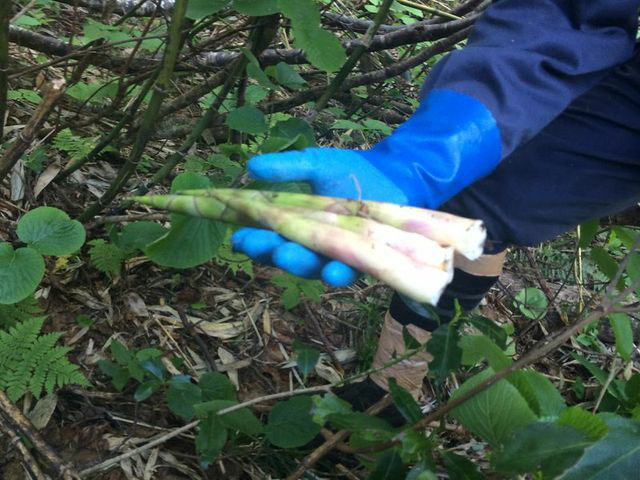 始めは、佐藤さんには直ぐに目に入る筍が、なかなか目に入りませんでしたが、徐々に目に入るようになりました。この作業は実は集中すると危険が伴います。笹薮に入ると周りは背の高さも2~3mぐらいのササタケしか見えず、気がつくと、慣れた人でも迷ってしまうほど、方向感覚が無くなります。また、熊もこの月山筍が好きなので、偶然、遭遇したりすることもあるとか。また、見つけた筍を採るときに枯笹で目を痛めてしまうこともあるそうです。素人が山に入って採るのは、とても危険だといいます。