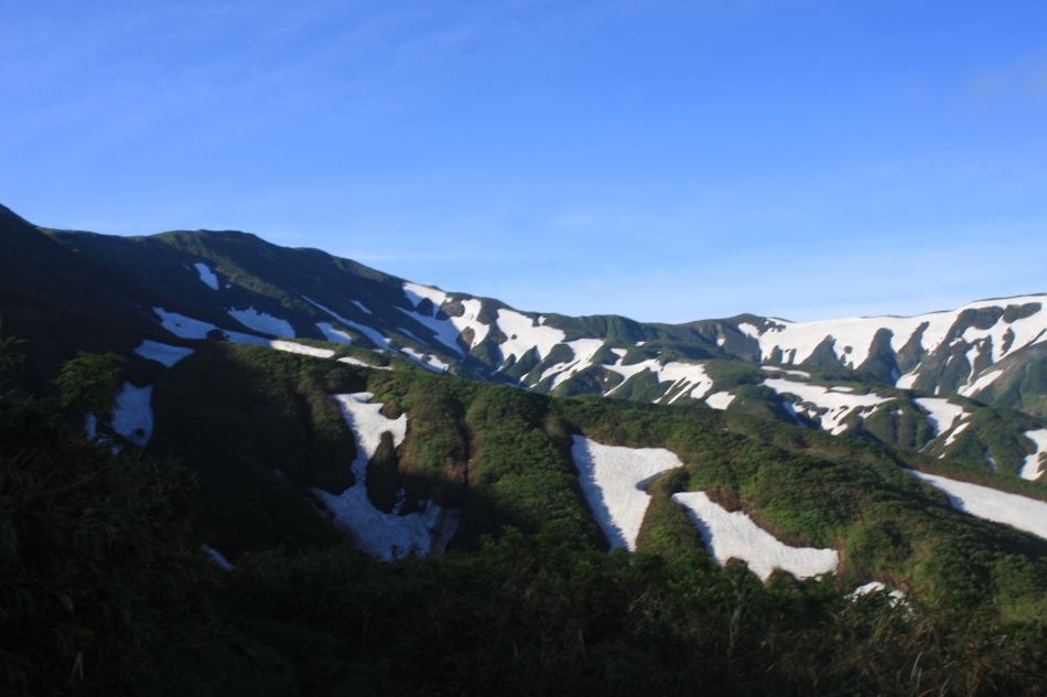 沢まで降りたと思えば、雪渓を渡り、また尾根まで登り、そしてまた沢まで降りるということのくり返しです。