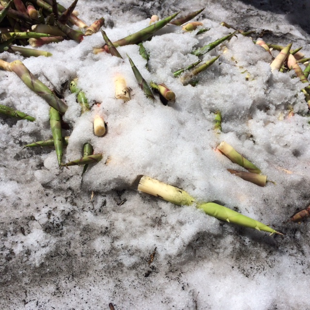 佐藤さんが一度に採る筍はおよそ20〜40キロ。鮮度を保持するために、採取する量がある程度になると近くの雪渓に穴を掘り、そこへ筍を埋めておきます。