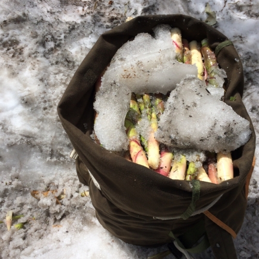 場所を移動しながら何度か採取をくりかえし、採取を終えると布のリュックに隙間ができないように丁寧に詰めます。最後に堅雪を上にのせて終了。筍は乾燥を嫌うので、そのために布製のリュックにいれ、また歩いているうちに背中の熱で筍が蒸れないように雪を入れる訳です。ここまで気を遣うのには、鮮度を保つためのお客さんへの最大の心遣いと言えるでしょう。