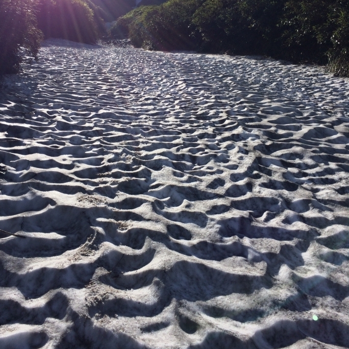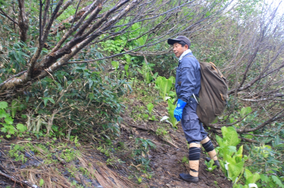 帰り道、自分の荷物も合わせ30キロちかいリュックを背に一歩一歩雪渓を進み、谷を登り、また8合目まで戻りました。途中息があがるほどの急な斜面もあります。月山筍を採るのにこんなに大変なこととは、食べる人のどれくらいの人がわかっているのでしょう。
