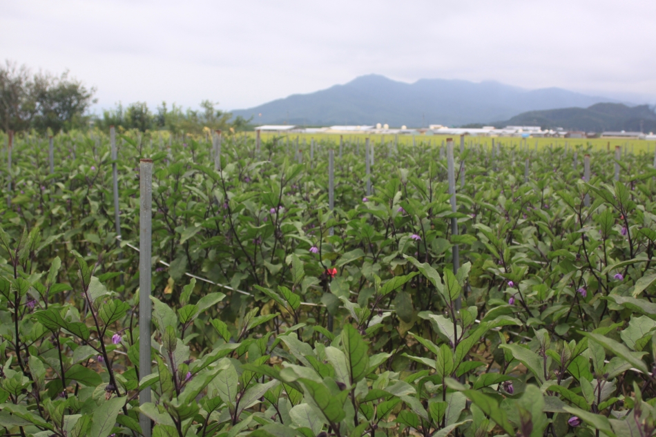 連作障害があるので接木しても5年に一度作付ける土地をまわします。 昔の民田なすはせいぜい大きくても高さ1メートル位にしかならなかったが、現在は1.5メートル位になるとのこと。 昔は減反もなく、畑が今より少ない面積だったため、苗を密に植えていましたが、今は沢山植える場所があるので、連作障害を防ぐのと収量を増やすために植える間隔を広くしています。