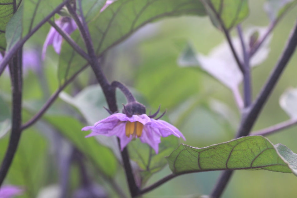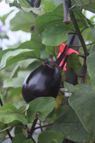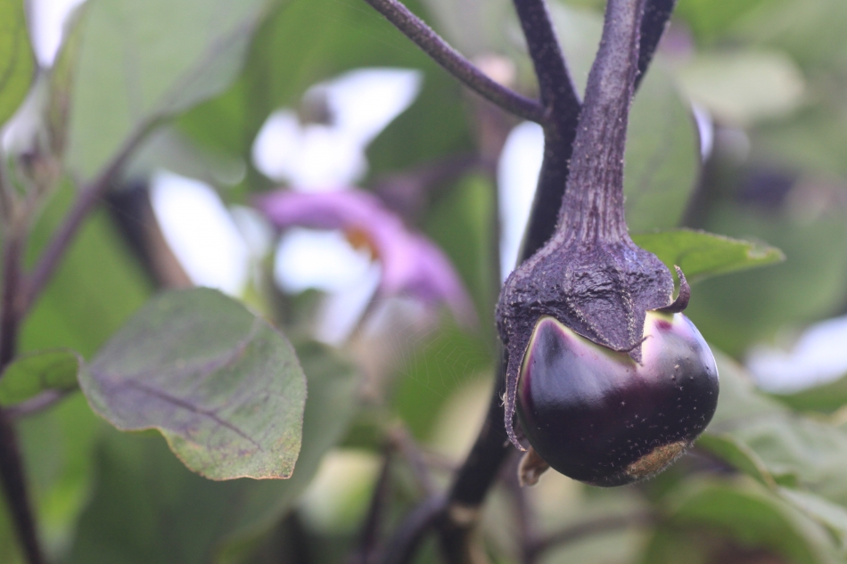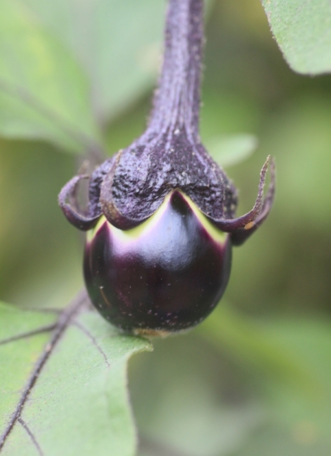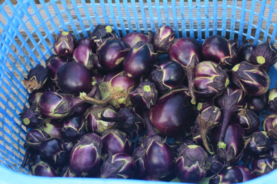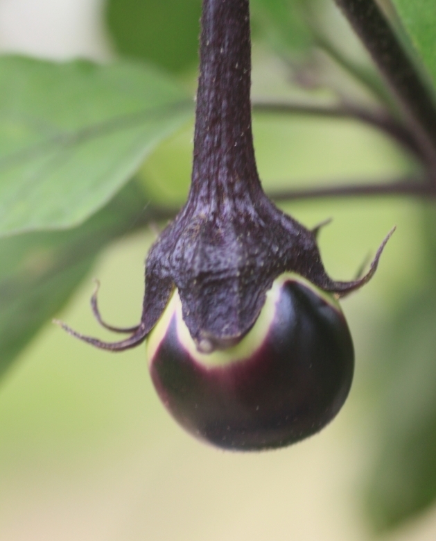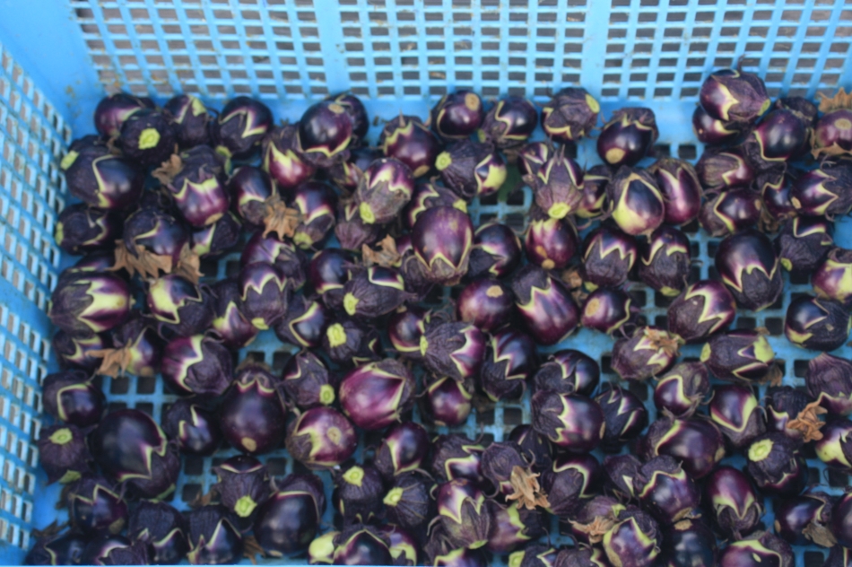 手のひらにのるくらい小さななす。 わずか8?15グラムが一番美味しい大きさだといいます。よくみるとへたの下が白い。この白い部分が一日で成長した部分だとか。