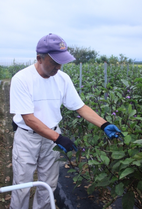 数年前までは1,000〜1,200本ほどの民田なすを植えていましたが、年々歳をとり作業が大変になったことと、それまで奥様と二人で作業していたのが、都合により奥様の手が借りられず、精三さんお一人での作業となったため、今年は600本ほどの作付けをしました。