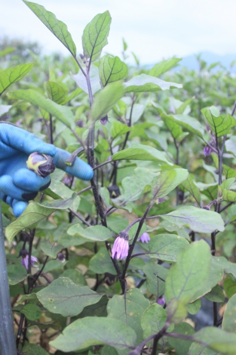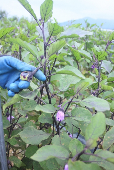 一般になすの収穫は、ヘタのところをハサミで切りますが、民田なすはハサミを使わず、一つ一つ手で収穫して行きます。 ヘタのところに指を添え、クッとひねるとポキッと良い音を響かせて民田なすがとれます。