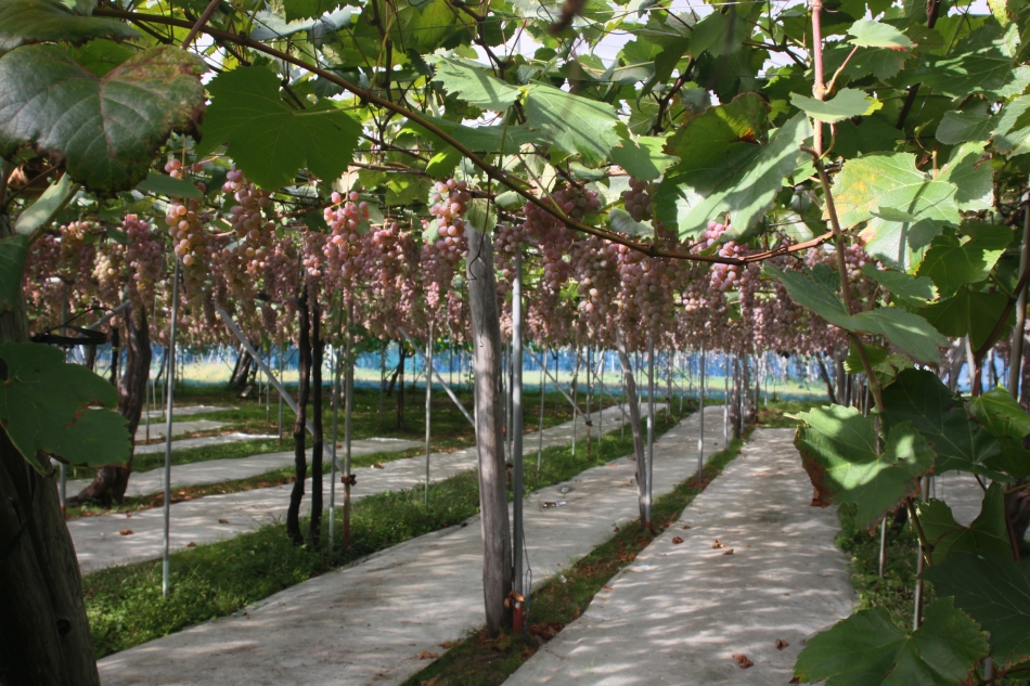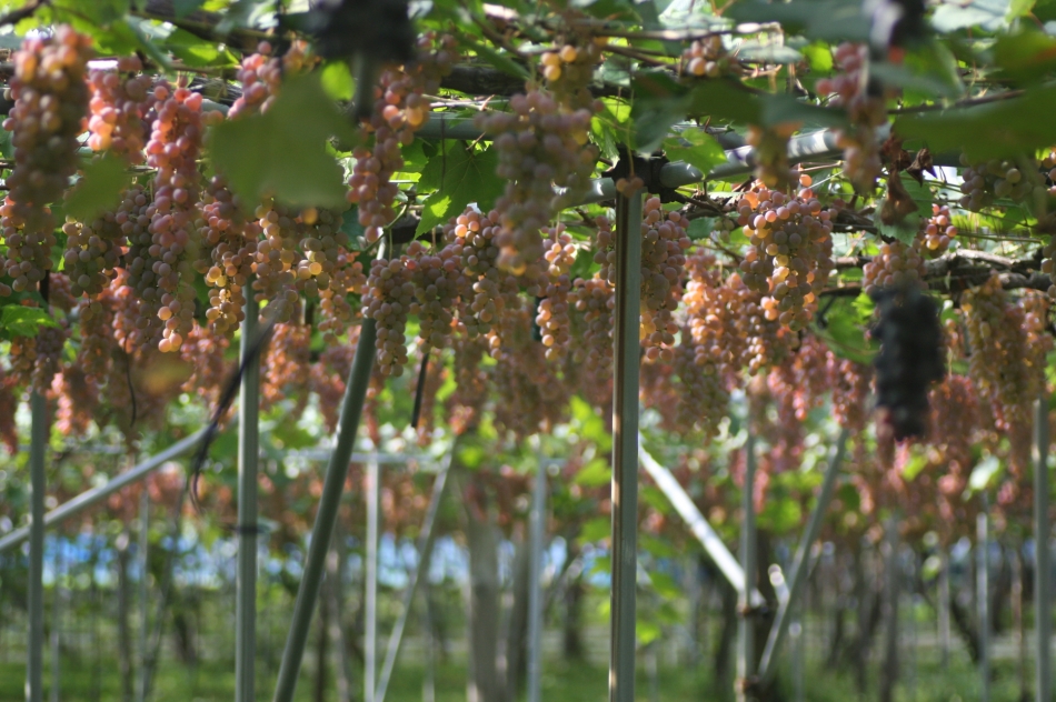 雨避けのかかったブドウ畑に入ると甘い香りが漂い、日差しが心地よい。