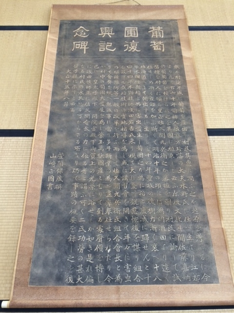 甲州ブドウの歴史をひも解くのに先ず、西荒屋地区にある河内神社を訪れました。境内の片すみに大きな石碑があります(写真左下)。これに書いてある内容がよくわかるようにと、産直あぐりの隣にある西荒屋公民館(西荒屋地区農林魚家・婦人活動促進施設)にある掛け軸を見せてもらいました(写真右下)。