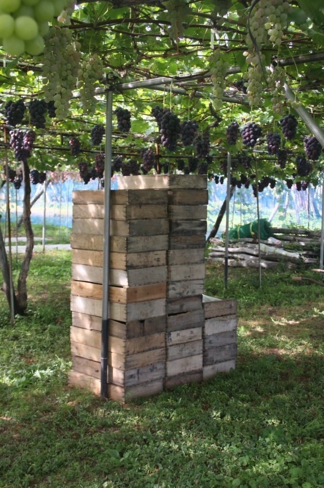 ブドウ畑の片すみに木箱が積み上げられていました。この木箱に収穫した甲州ブドウを入れ、家屋の北側の涼しいところで保管すると数ヶ月も保存ができ、昔は真冬に炬燵に入りながらブドウを食べていたとか。そしてお雛様にもブドウをお供えしていました。長い期間貯蔵できるのはこの甲州ブドウの保水性の良いという特徴でもあるそうです。