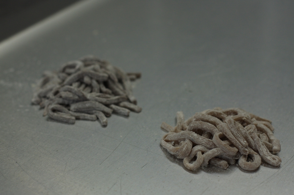 早速、「切り山椒」を作るところを見せてもらうと、前日までに下ごしらえしてあった生地がありました。「切り山椒」には、使用する白砂糖と黒砂糖の違いから、白と黒があります。生地を次々に細長く機械で切っていきます。