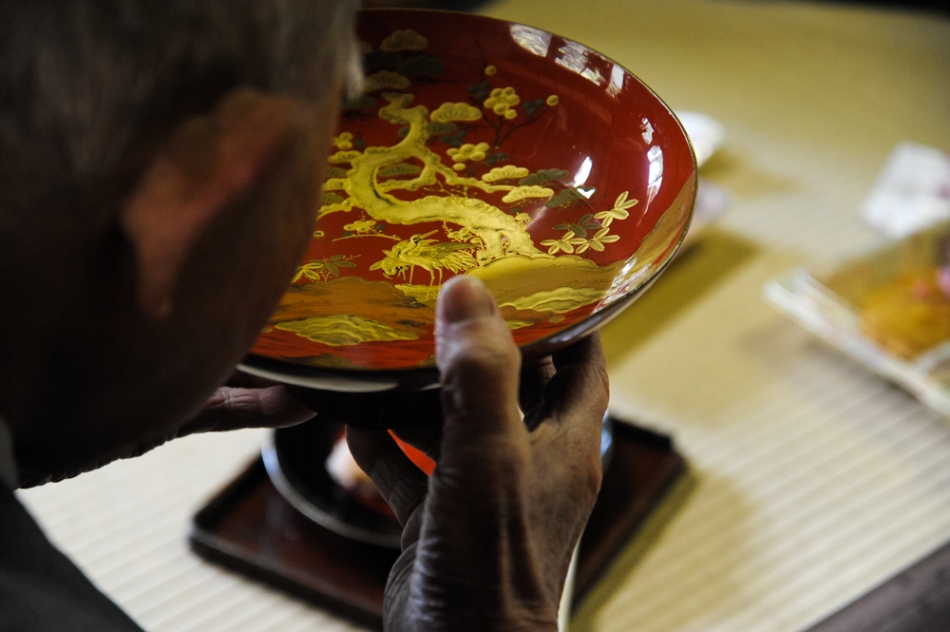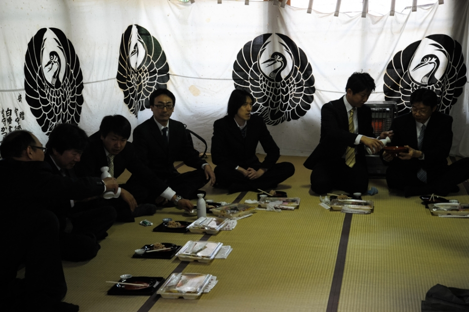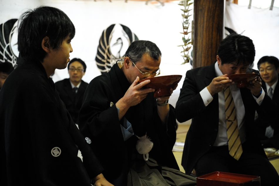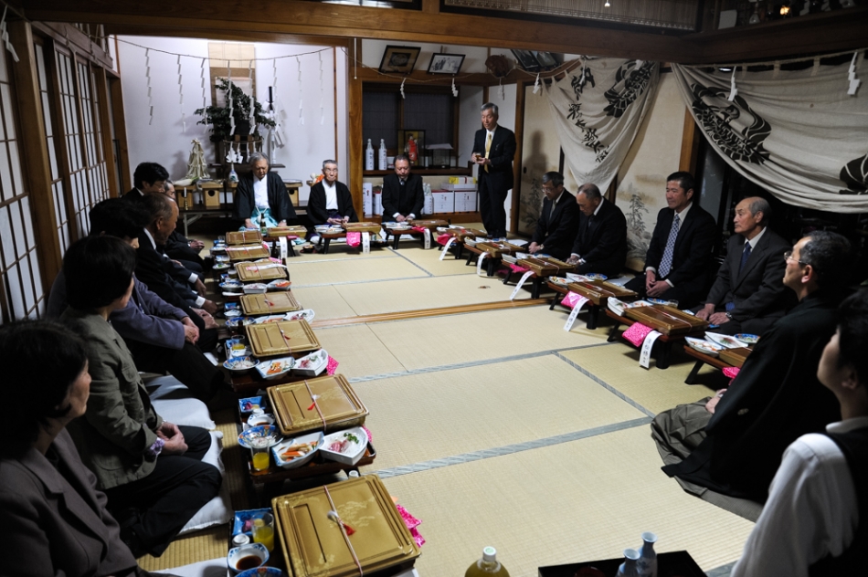 赤飯も全員の皿に取り分けられ、いただきます。最初は静粛に儀式を進めていた男衆も、お酒をまわしていくうちにだんだんにぎやかになり、あちこちから笑い声や話し声が聞こえるようになります。当屋が杯で酒を飲むときは皆が注目し、大杯が空になると拍手が沸き起こります。
