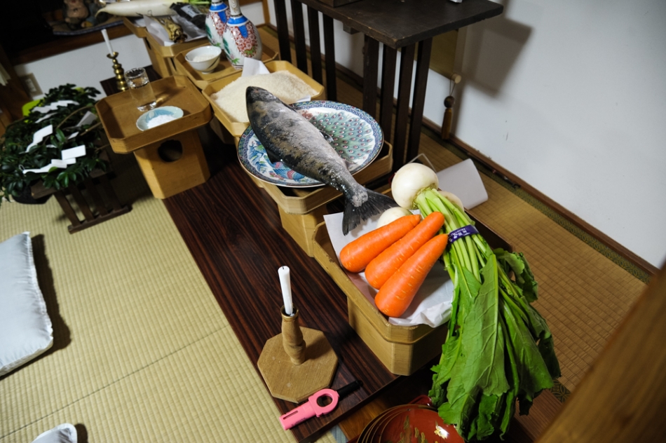 熊野神社の神饌(棒たら、鱒、生うど、大根、人参、白かぶ、研ぎ米、水、酒、昆布)