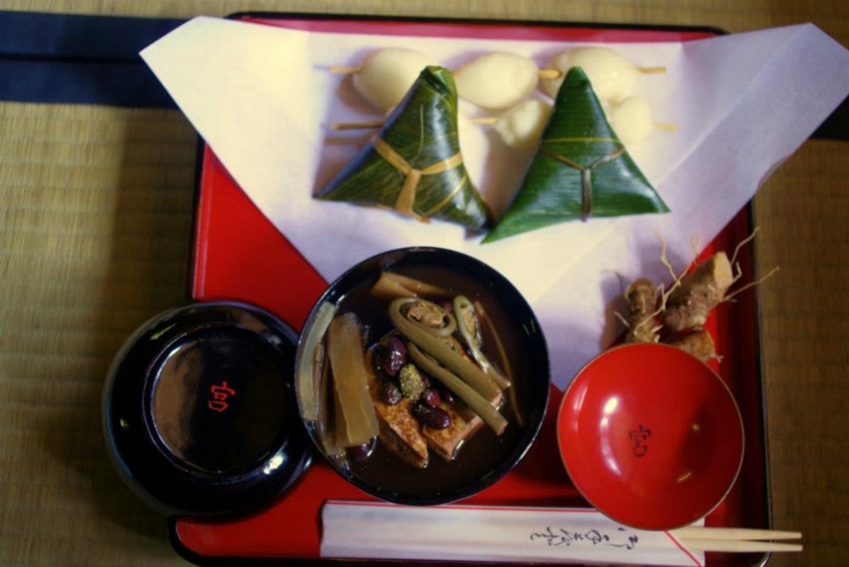 丁寧に作られた山菜料理(孟宗汁、ぜんまいとこんにゃくの煮物、赤こごみのごまみそ添え)