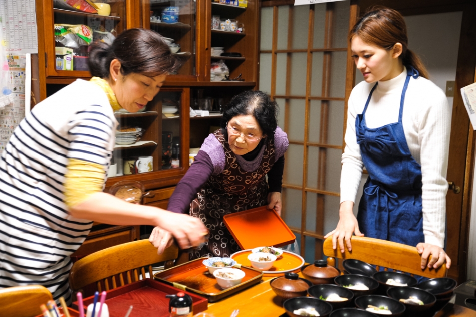 祭りの食事の準備をする宮守家の女性たち(恵里さん、愛さん、愛香さん)