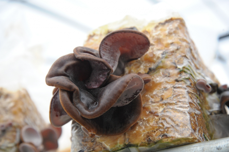 きくらげのハウスは湿気が重要。スプリンクラーでスコールのように雨が降り注いでいました。明るいハウスの中にきれいに並べられたきくらげの菌床。1年目は500個からはじめ、2年目に1500個、3年目に3000個と数を増やし、現在は4000個。お客さんの需要や認知度と共に生産数を増やしていると言います。