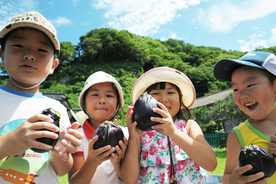 海と山に近い小堅保育園は体験活動に力を入れていて、食育の行事の時には、子どもたちも包丁を持って材料を切ったりするなど、自分たちでなんでもできるように場をつくっています。波渡ナスが地域に残っている在来種のナスだということがわかった翌春の2016年から、小堅保育園の子ども達が地域のおばあさんたちに話を聞きながら波渡ナスを育てる“波渡なすチャレンジ”が始まりました。