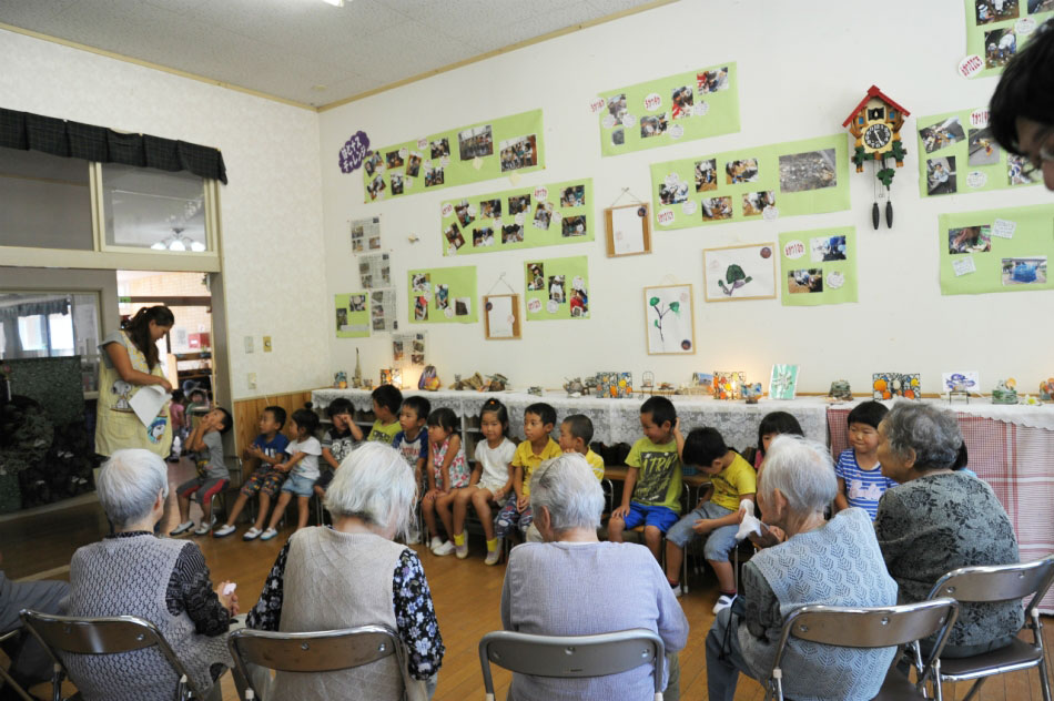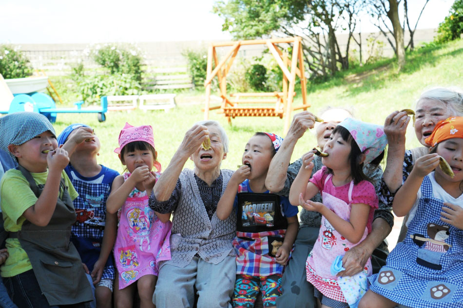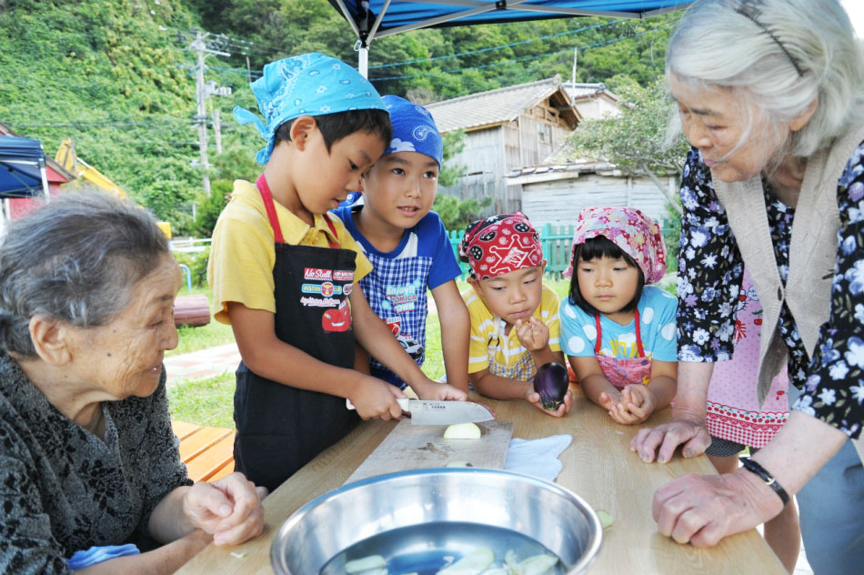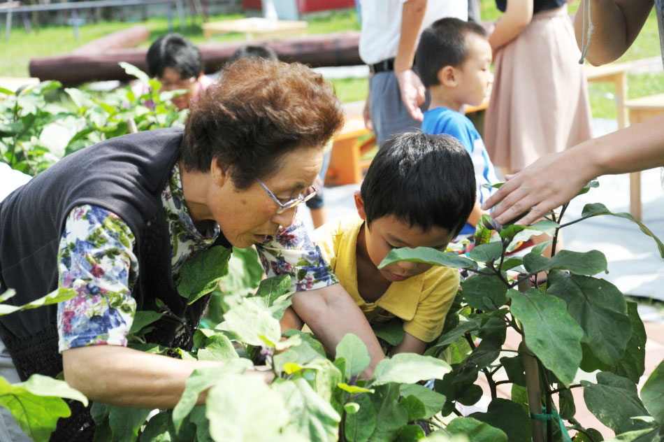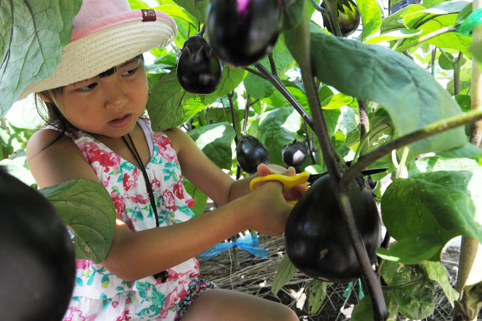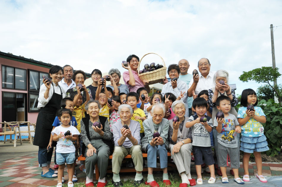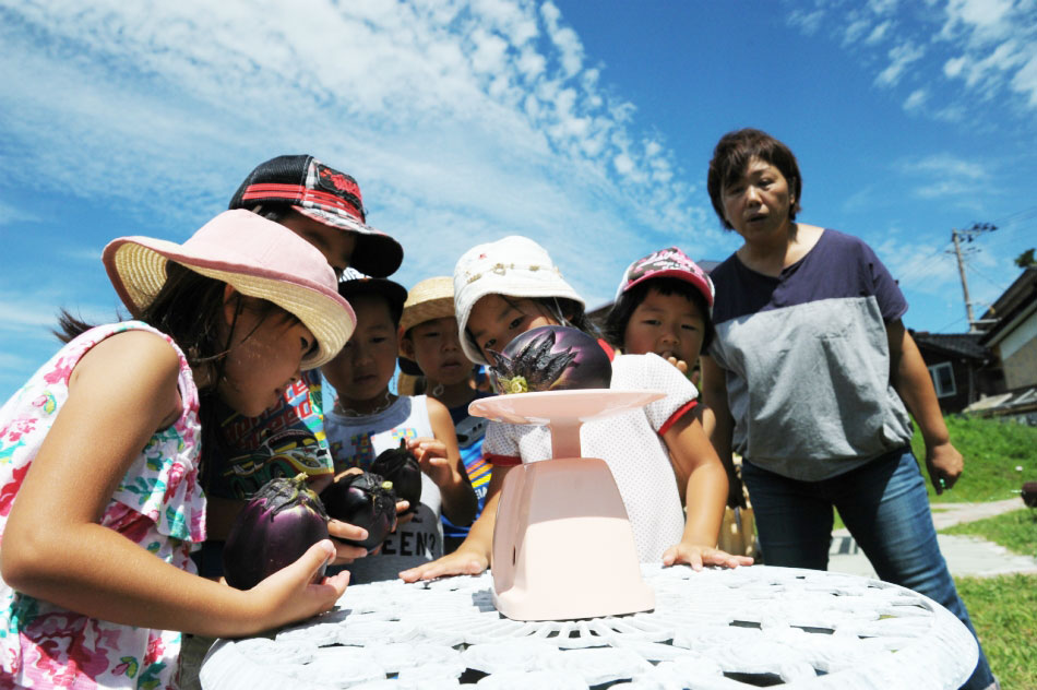 9月に開催した収穫祭では、地域のお年寄りを呼んで、海藤さんと子どもたちが波渡なすづくし料理をテーブルいっぱいに並べました。子どもたちは手に持ちきれないほどの大きいナスを、一生懸命はさみで収穫しました。へたの部分を指さしながら、「ここ触って。針あるの。大人になったしょうこだよ」と収穫したばかりのナスを得意げに見せてくれました。「みんな育てるのじょんずで」とおばあちゃんたちもとてもうれしそう。子どもたちが包丁でぴかぴかのナスを切るのをながめながら、目を細めます。