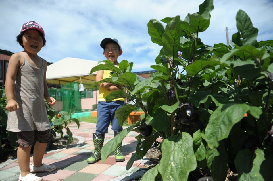 大きくなっていくにつれ、植え替えや定植をし、8月には初収穫を迎えました。名札を付けて、大きくなった苗をみせながら「これがぼくの苗!」と子どもたちは教えてくれます。「朝来ると、まず水やりが日課になった。先生に言われなくても自発的にやるし、やっていない子がいると声をかけたり、みんなすごく大事になすを育てています。」と園長先生。今年、小堅保育園では園庭を改築したのですが、その時に、ナスを定植する場所をまんなかに作りました。子どもたちに案内してもらうと「はとナスだからハートの形してるの」と紹介してくれました。