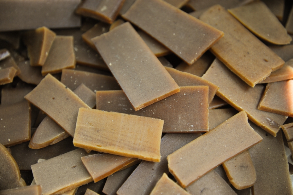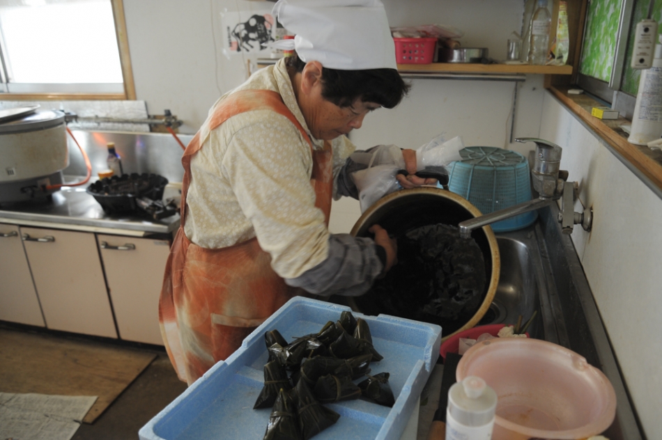 「これが、あく水に漬けたもち米だよ。」とヒサエさんは黄色く染まったもち米をみせてくれました。あく水は、ナラの灰でつくります。今は、山間の地域とはいえ薪ストーブを使う家も少ないため、薪ストーブのある家から灰を譲ってもらっています。ナラの灰を約2時間水で煮て、10日間ほど静かに置いておき、灰が沈殿するので上澄み液を取り出して、ガーゼで濾し、一升瓶で保管しておきます。注文が入ればこのあく水に4日間以上つけておきます。ここできちんと時間を取ることで、芯までしっかりとしみこみ、全体に黄色い色が入ります。つけている間は、まんべんなく行きわたるようできるだけ何度もかき混ぜます。