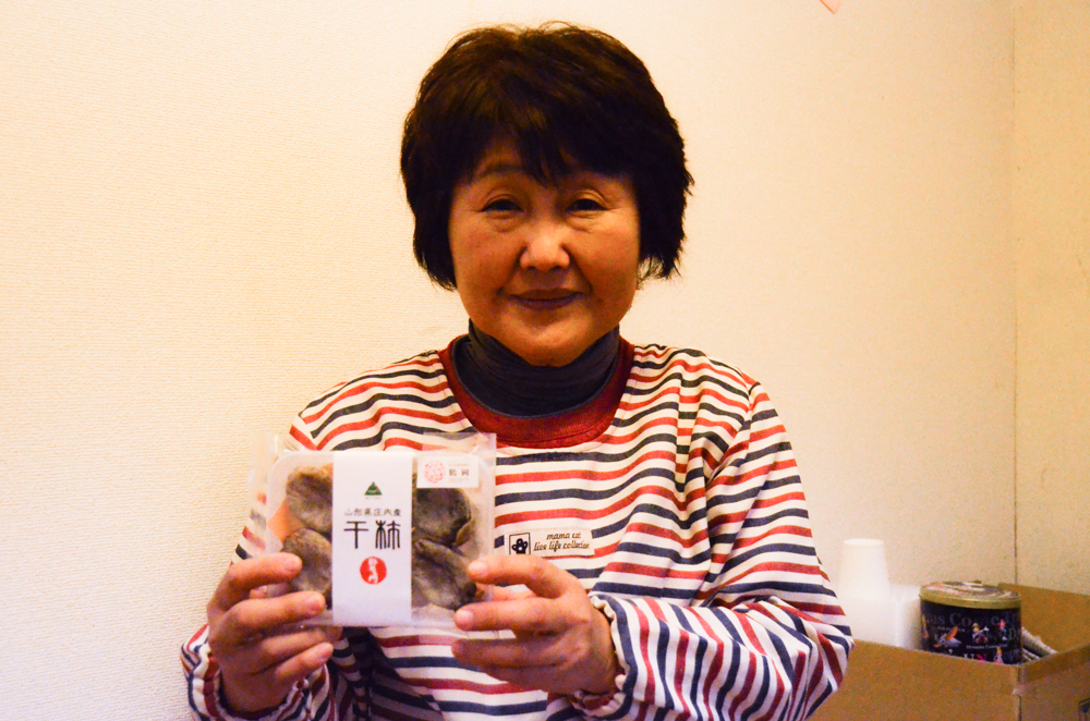 エヌ・Kファームが一番忙しくなるのが10月末から1月の柿の最盛期です。多いときは10人前後のパートさんが入り、干し柿づくりの作業に加え、出荷の作業もあるので休む暇はないそうです。干し柿の販売は15年ほど前からスタートしましたが、5年前に地元デザイナーにパッケージデザインをしてもらい、現在の形になりました。特に、首都圏での販売の際、デザインが目を引くよさがある、とおっしゃっています。