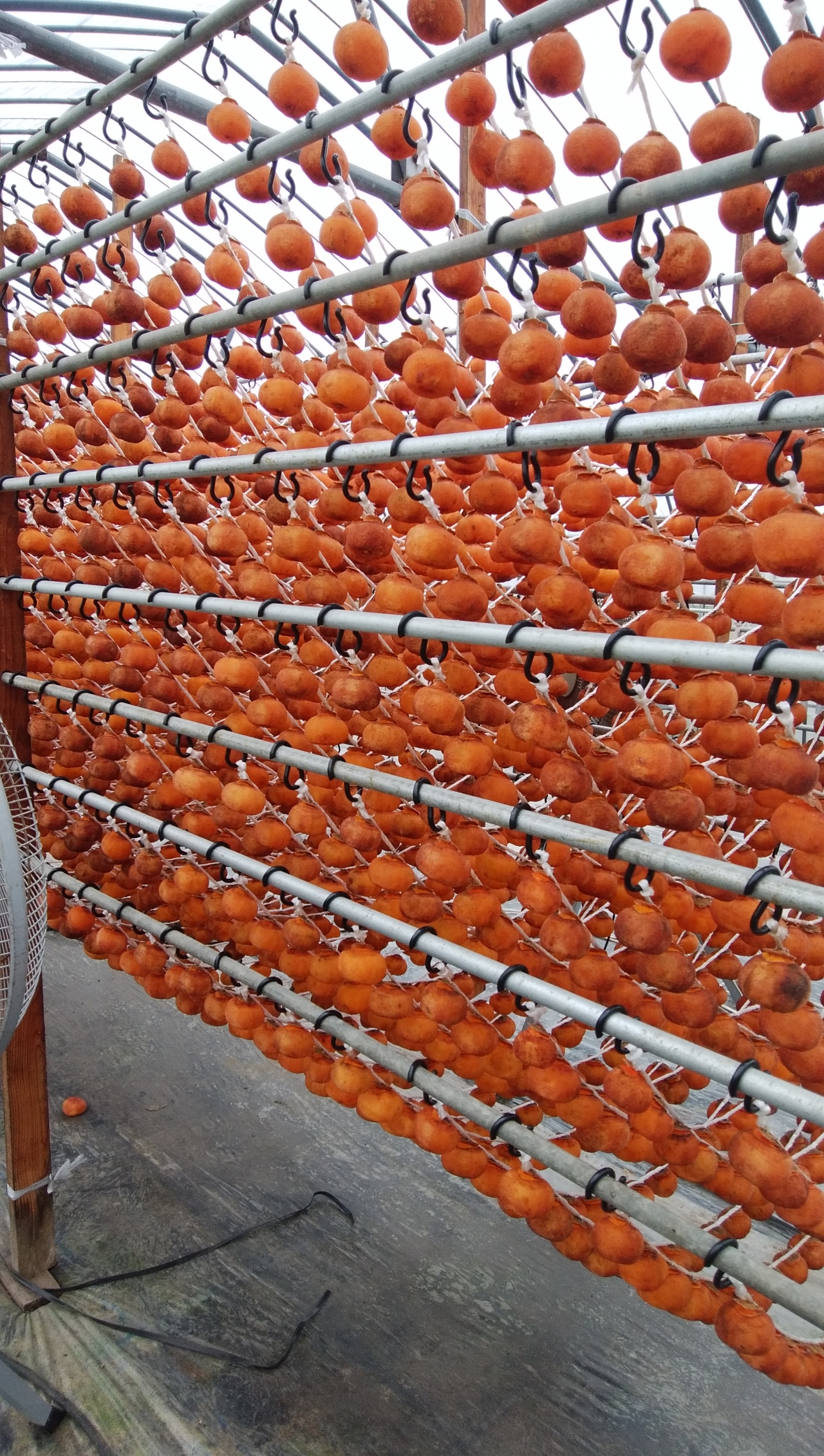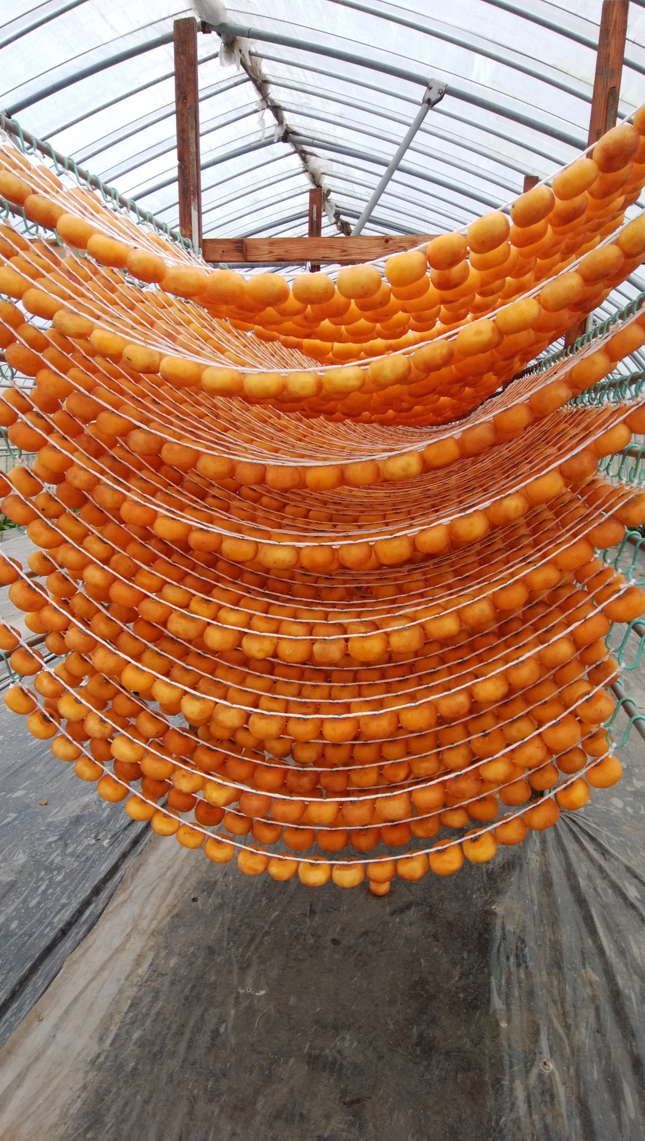 作業は、9月初旬の柿もぎからスタートします。ヘタをきれいに整え、電動皮むき器で皮をむきます。18~19個ずつ紐に取り付け、ビニールハウスの中で約2週間干します。乾燥が進み、色が変わってきたころに別の部屋にうつし4~5日管理しながら仕上げ乾燥をします。干しの作業が完了したら、仕上げです。紐から一つずつ丁寧にはずし、干し柿を美しくする糖分を表面に浮き出させる作業をします。家庭用や少量であれば、たわしなどで表面にやさしい傷をつけるという方法もありますが、エヌ・Kファームでは相当の量なので、柿もみ機という機械で干し柿の表面に傷をつけます。この、丁寧に傷をつけるという工程を経た干し柿は白く、粉砂糖をまとったような姿になり、高級和菓子顔負けの上品な見た目になります。糖分が浮いてくるということは、甘さの証拠でもあると言われており、その昔、砂糖が高価な時代にはそぎ落として砂糖の代用にしたという話もあるほどです。この作業のあと、干し柿は手作業で成形され、白くなるのを待ちパック詰めされます。