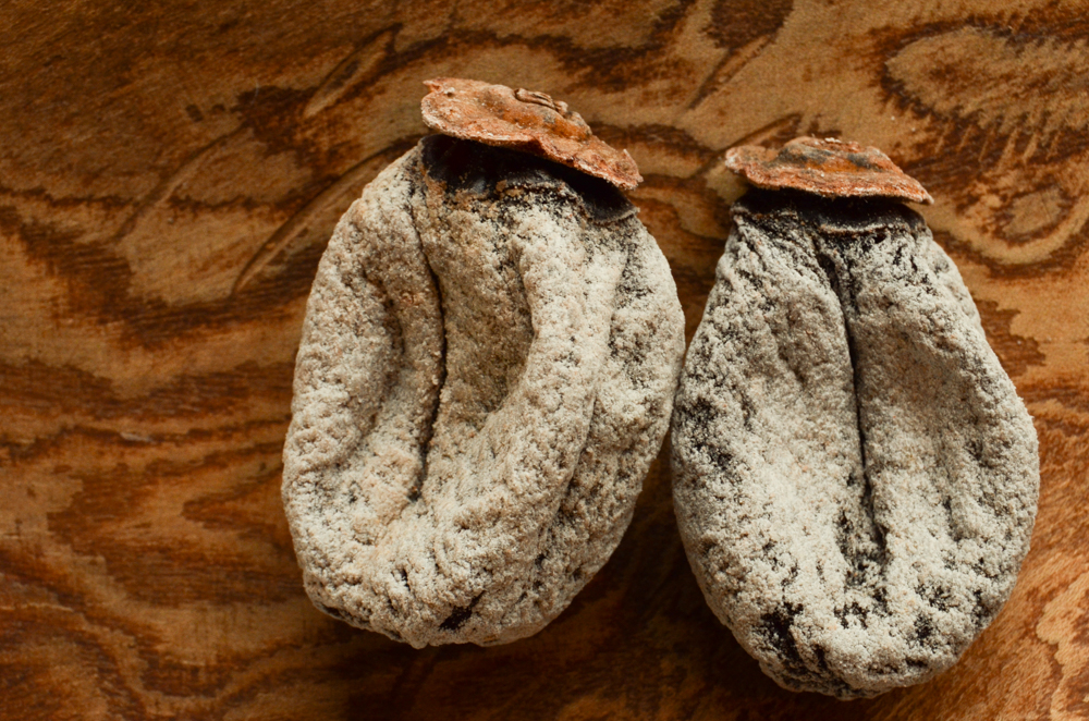 表面に白い粉が付着していることが多いが、これは柿の実の糖分が結晶化したものである。主にマニトール、ブドウ糖、果糖、ショ糖からなる。日本ではかつてこれを集めて砂糖の代用とし、中国ではこれを「柿霜」(しそう)と呼んで生薬とした。