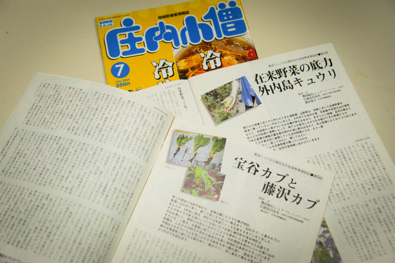 「奥田さんの東京修業時代に、使っていた野菜がいつもより高かったので業者にどうして高いのか聞いたら、庄内産だからだ、と答えたんだそうです。農家から仕入れた時はそんなに値段は変わらず、むしろ安いくらいかもしれないのに、業者は庄内産が品質がいいからいい値段をつけていたんですよ。奥田さんはその時、地元の人にいい野菜であるということを知ってもらいたいと強く思い、鶴岡に店を出すことにしたんだそうです。「地域の食材にこだわって料理を出したいのなら、これから在来野菜を調査しようと考えているので、一緒に農家を訪問しませんか」と私が提案し、そのあたりから仲良くなりました。2003年の8月からは、雑誌「庄内小僧」への連載が始まり、奥田さんと私の二人で在来作物の農家の取材をして回りました。」