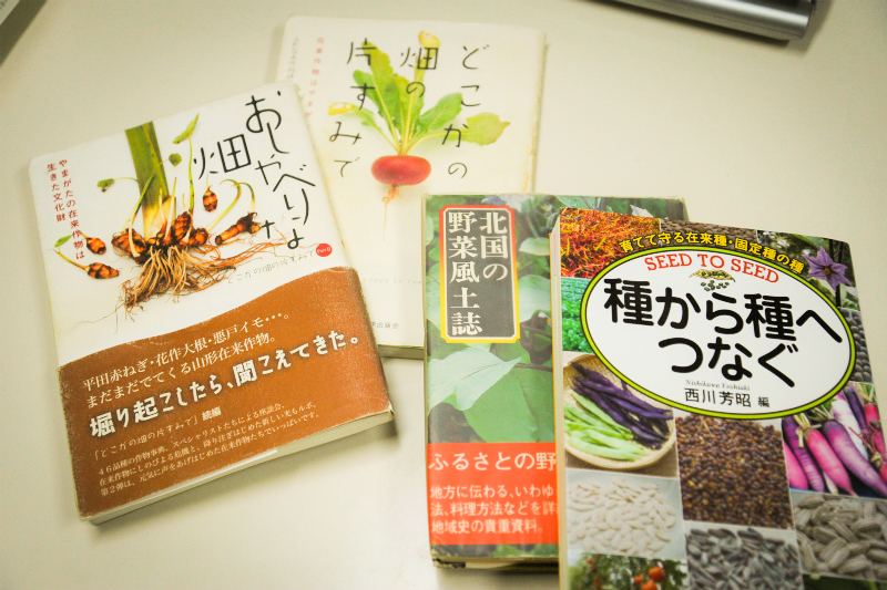2000年ころから江頭先生は、当時あまり知られていなかった「在来作物」に注目し調査をし始めました。1976年に発行された、かつて山形大学農学部で教鞭をとっていた青葉高氏の「北国の野菜風土誌」という本があります。これには、当時の土地ごとに大切に守られてきた作物の状況が綴られているのですが、図鑑ではないので索引がついておらず、江頭先生の所有のものは気になる箇所に付箋を付けた付箋だらけのものだったと言います。それをまず、作物ごとに分類分けし、山形県の在来作物の調査のためのした資料としてデータベース化しました。