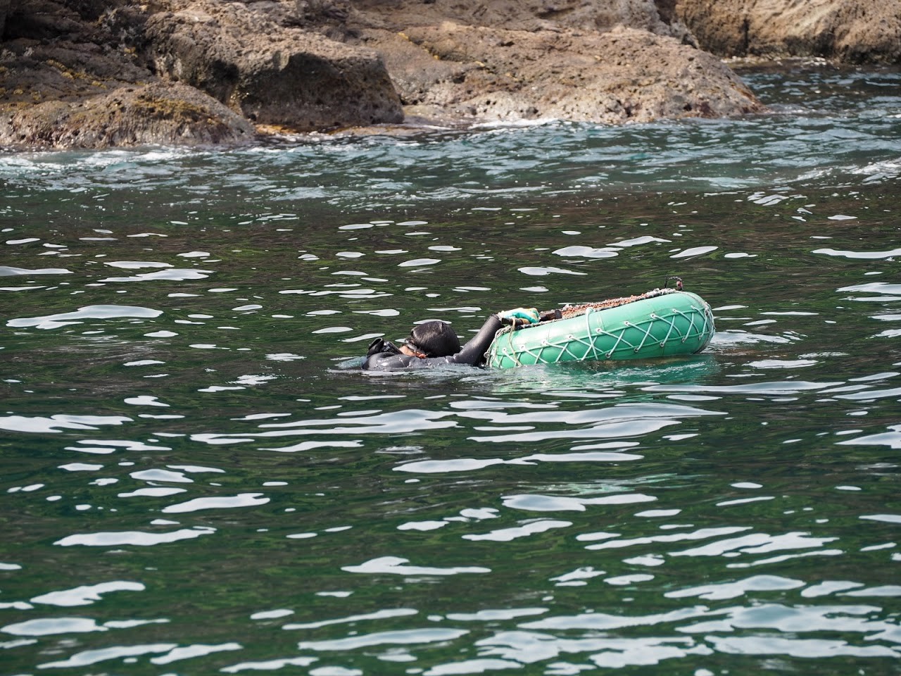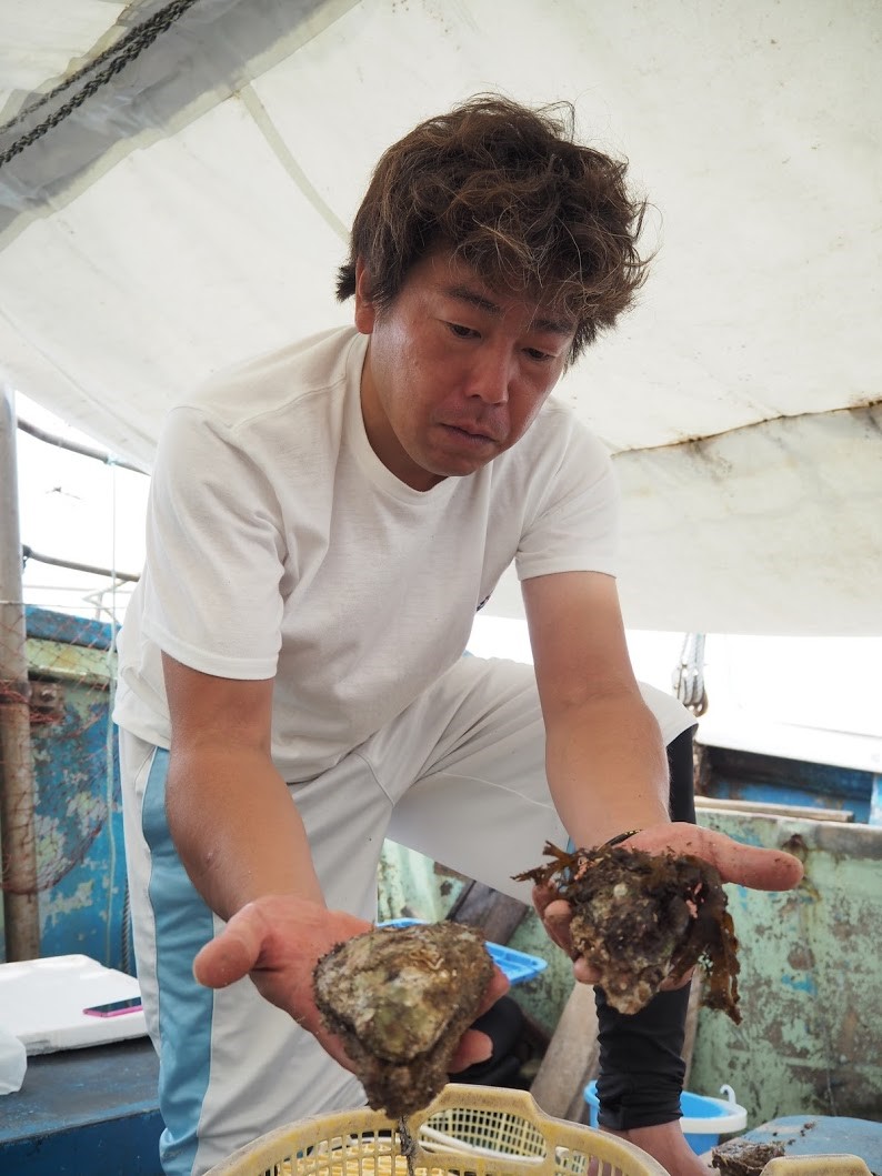昭さんが若い頃は、漁に出られない夏の禁漁期間のこの時期は北海道にイカ漁に行ったりしていたそうで、佐藤家では隼人さんが漁師になってから「岩ガキ」漁を始めたそうです。同じ由良の先輩漁師を師匠と仰ぎ、獲り方や潜るスポットなどを一から学んだのだとか。家族だけではなく、周りの漁師仲間からも支えられながら漁師として腕を上げていったそうです。