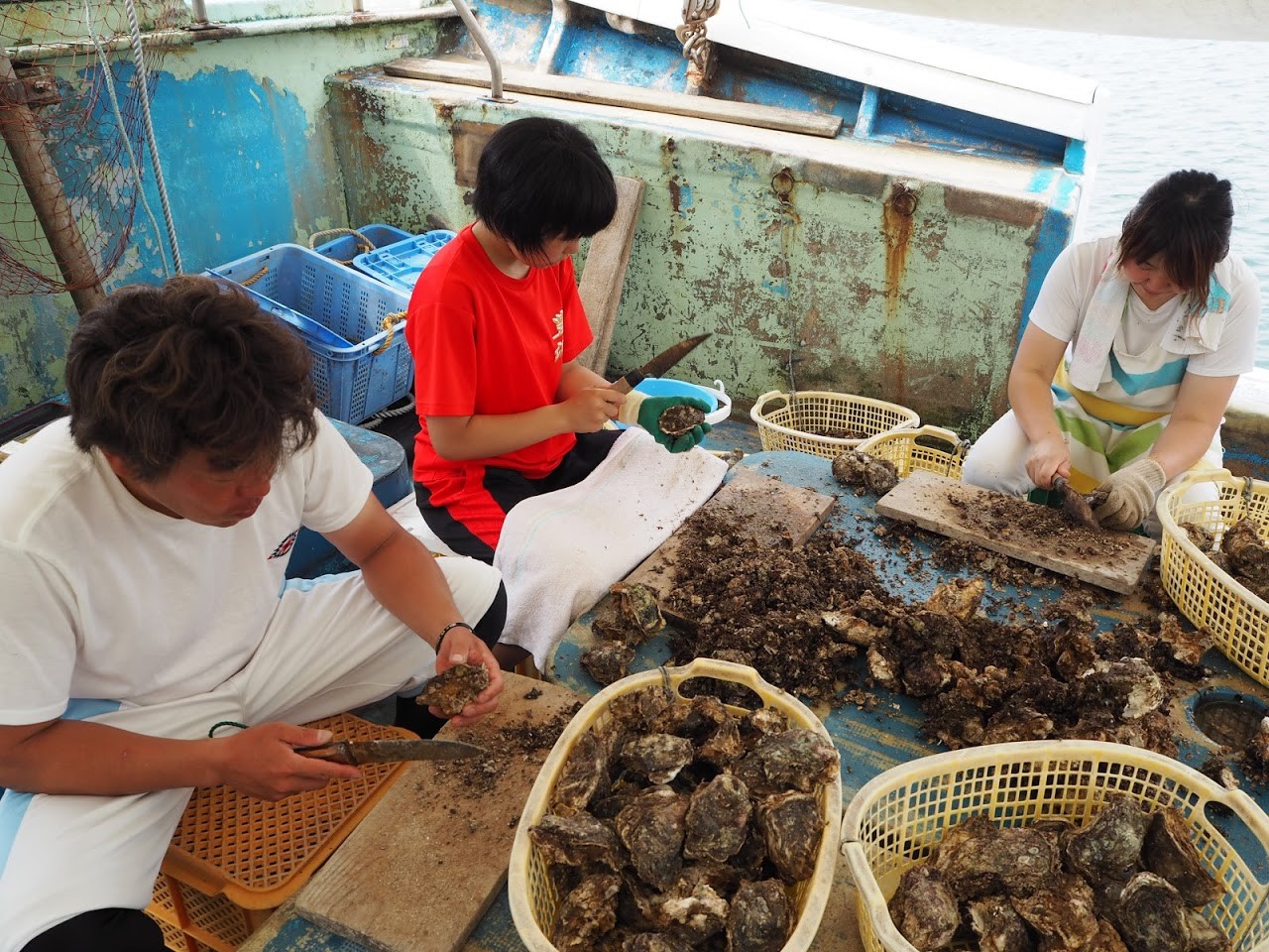 獲ってきた岩ガキを、岸壁に停泊している「長宝丸」の船上に持ち帰ります。16時の出荷に間に合うように、ここからひと手間かけます。昭さん、みどりさんに加え、夏休みに入っていたこの日はお嫁さんの明香さん・中学2年の娘さんも作業に合流し、岩ガキに付着した海藻・フジツボなどを包丁でたたきながら綺麗に取り除いていました(佐藤家ではこの作業は「牡蠣トントン」という愛称で呼ばれます)。明香さんは娘さんが本当に小さい頃からこの船の上に連れてきていたのだとか。娘さんは大人の真似をしながら遊び感覚で自然と手伝いをするようになり、今ではみんなが太鼓判を押すほど大人顔負けの腕前です。