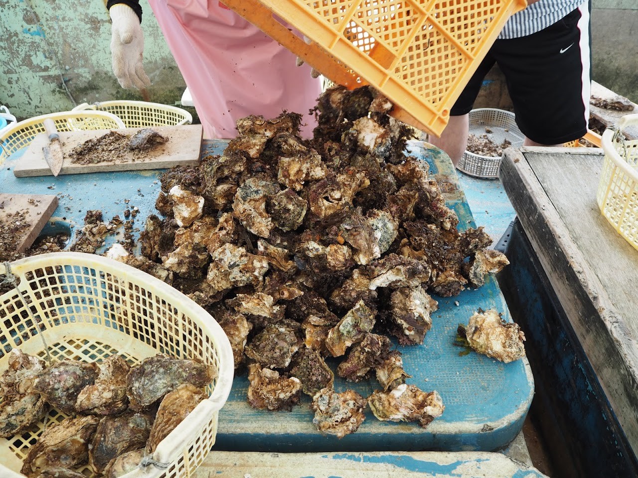 養殖が出来ない土地柄だからこそ、天然の恵みのありがたみを感じ、その資源を守っていこうという保全の取組も昔から熱心に行われてきました。この由良地区では獲る量は「一人一日5箱まで」と制限されており、獲っていいサイズも決まっています。このほかにも、岩ガキが定着しやすいようにテトラポッドを沈めたり、と様々な工夫がされているそうです。有限な資源をいかに守りながら漁業の課題と向き合っていくか。地域の団結力も求められるのだなと思いました。