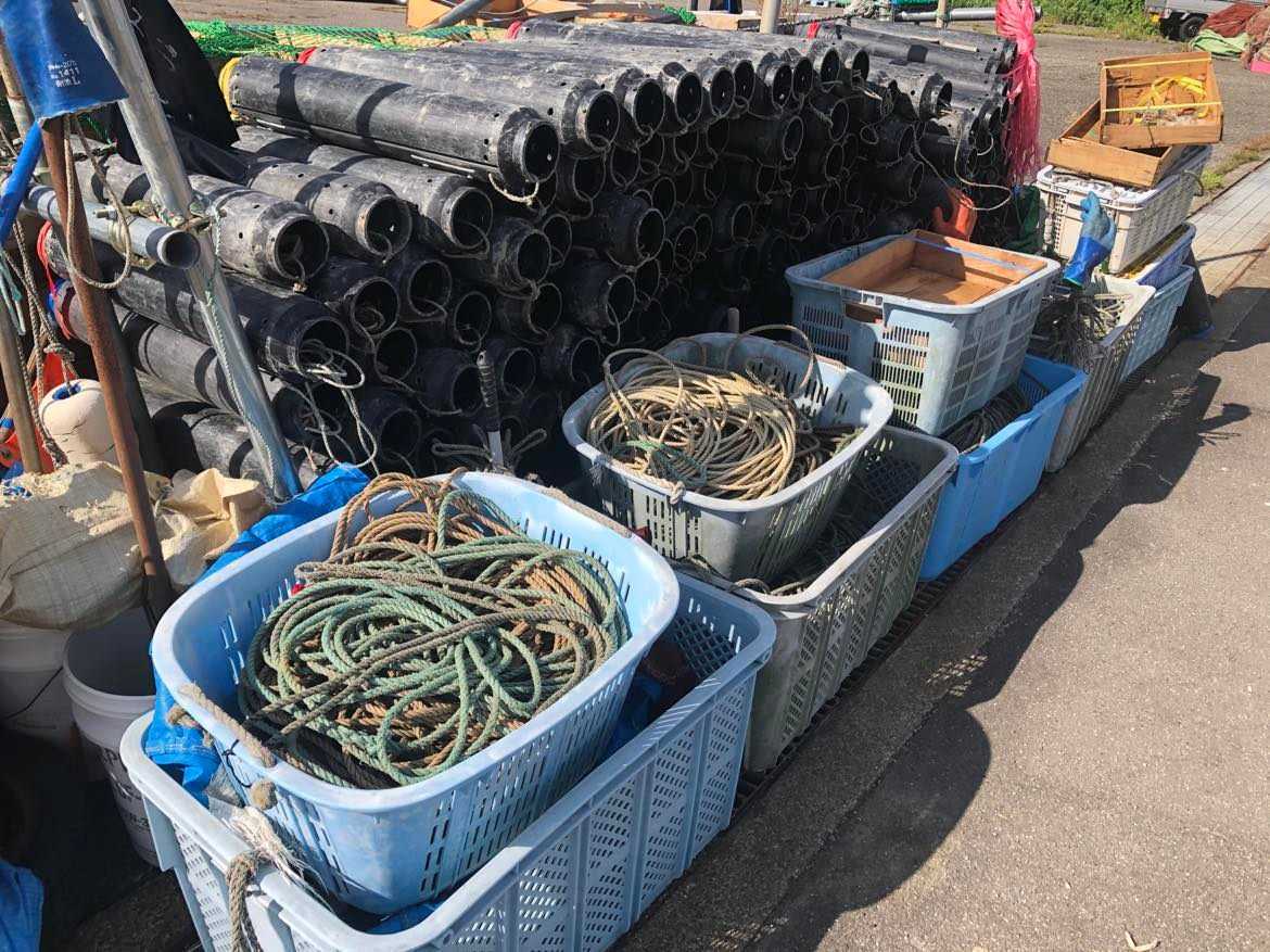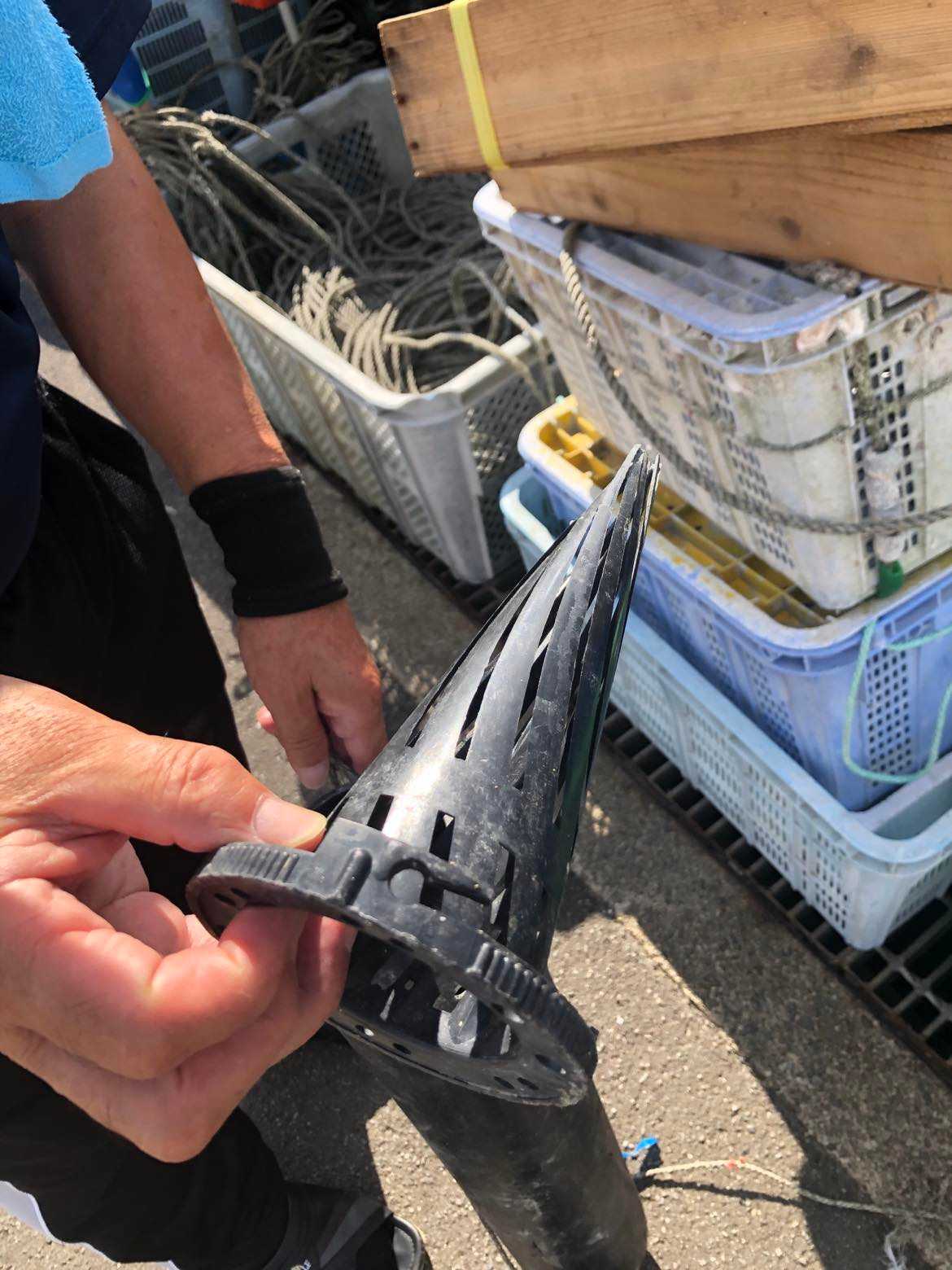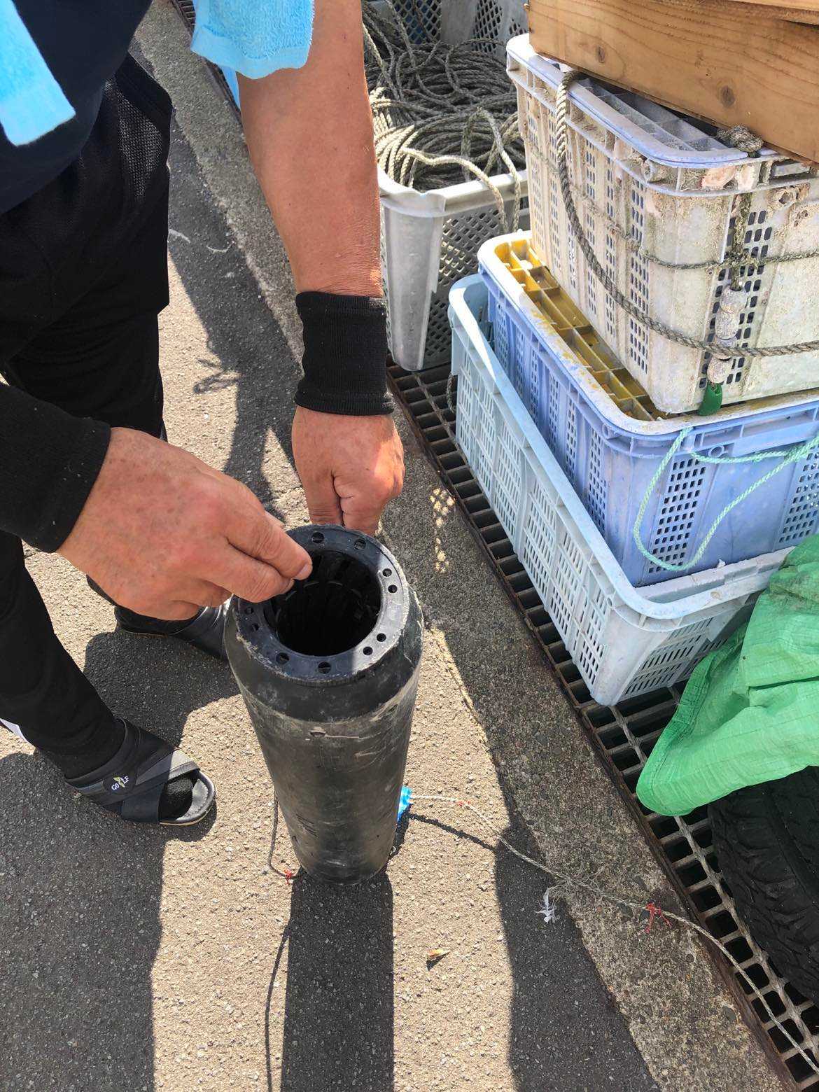 漁は、筒に餌を入れ、30m間隔に縄で100個ほど連結し、海に沈めます。餌は、カツオやサバを1筒に1切れ入れます。餌をサンマやアジでも行ったことがあるそうですが、餌を食べた「由良アナゴ」に細い骨が残ると食べ辛いことがわかりました。さらに「由良アナゴ」は餌でアナゴの色が変わり、赤い魚と白身の魚のときとアナゴの色違うのだと田村さんは教えてくれました。