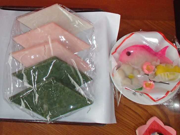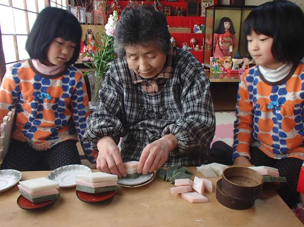 山田家では毎年3月3日の上巳の節句に合わせ、市内の菓子店で購入する練切の雛菓子の他に、三色のひし餅と雛あられを作りお雛様にお供えします。ひし餅の赤は食紅、緑は草餅で、白は最近はとち餅で作ります。ひし餅を切った余りの切れ端は、小さく切り乾燥させ、翌年の雛祭りの時に炒って雛あられにします。また山田家には一本のとちの木があり、千枝さんはとちの実のアク抜きからとち餅作りまでを全て自分で行っています。