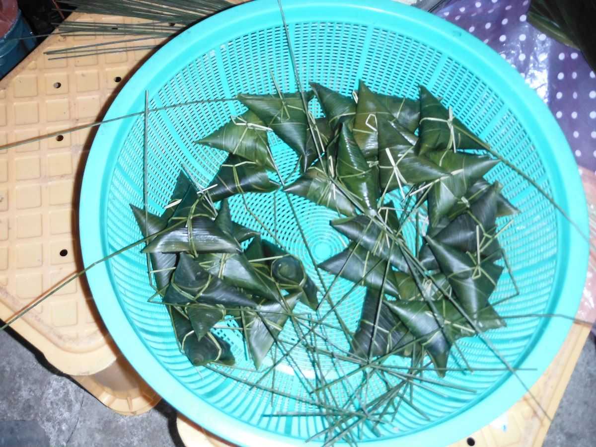 5月5日の端午の節句には笹巻を作ります。山田家の笹巻は、もち米を灰汁(あく)水に浸してそれを笹の葉で包んで茹でる黄色い三角巻の笹巻です。神様に供える笹巻には、よもぎの葉を添えます。また、御裾分けする笹巻にもよもぎの葉を添えます。