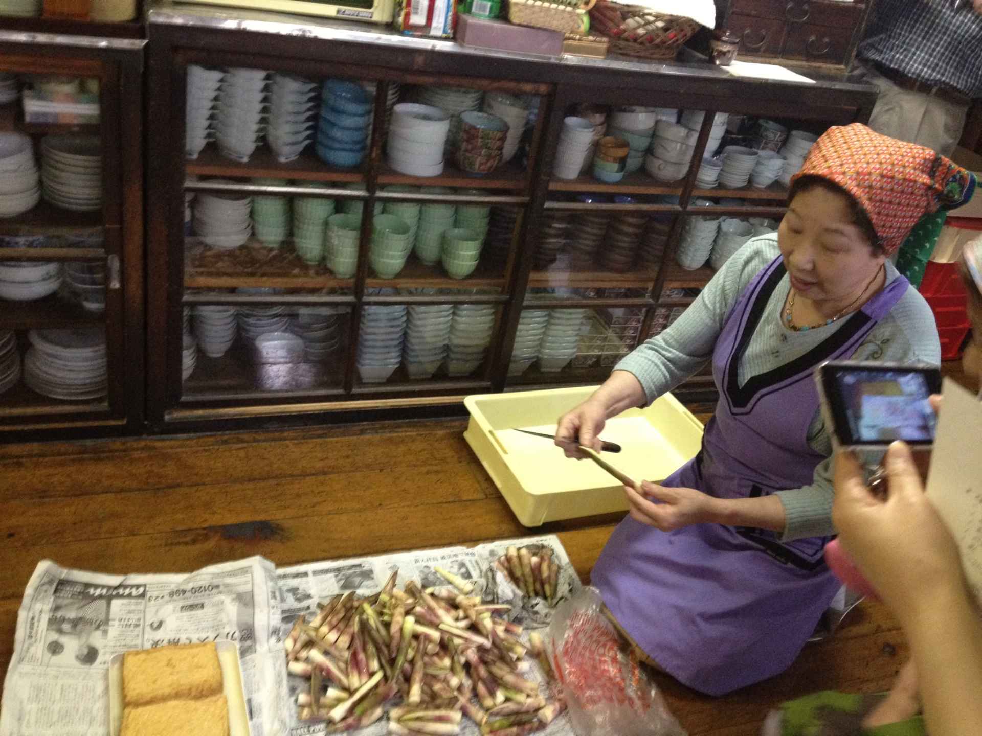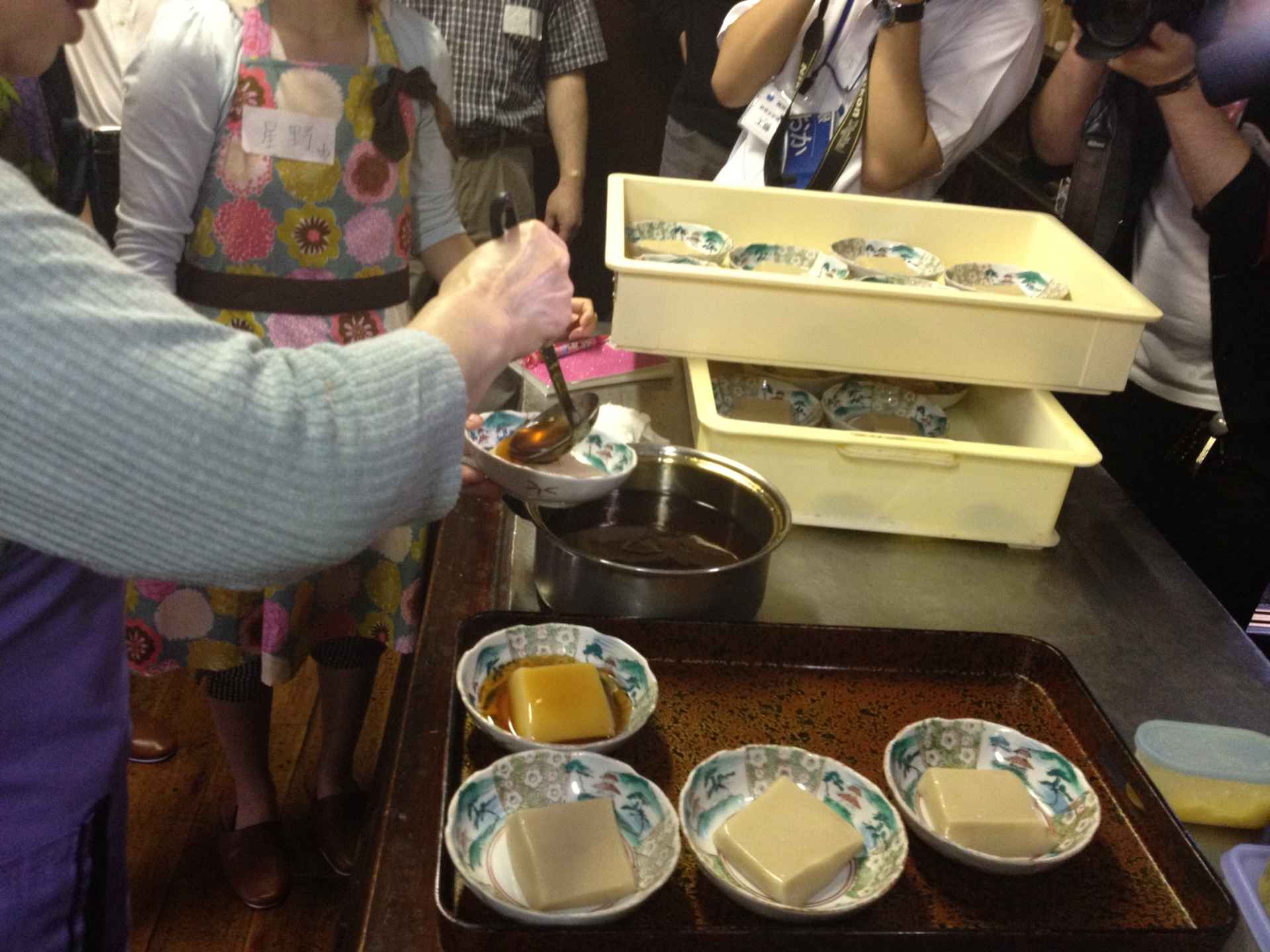2012年には発足会が開かれ、それに続いて鶴岡食文化女性リポーターたちが集い、月山筍の味噌汁やごま豆腐を作りました。またこのとき、豆腐と山芋を擦ったものを海苔にのせて揚げる「湊揚げ」を復活させました。手向地区にいる宿坊のお母さんたちは、実はこのとき初めてよその宿坊の台所に入り、互いに提供している精進料理の情報共有をしたといいます。