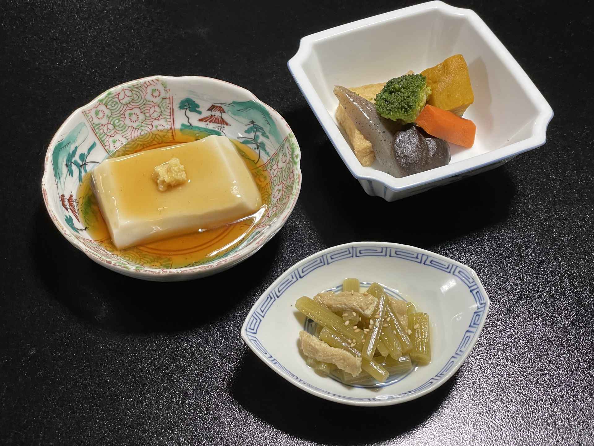 多聞館で昔から変わらず提供してきたものに、「ごま豆腐のあんかけ」と「山菜料理」があります。「多聞館のごま豆腐にはレシピがあるのか?」と尋ねると、レシピは存在せず、昔から材料の比率をお碗で測る作り方で伝わってきたきました。「白ごまを使用してごま豆腐を作り、あんをかけます。仏事の際には黒ごまのごま豆腐も作りますが、基本的には白ごまを使用します。ごま豆腐にあんをかけるのは庄内ならではの食べ方ですね。ですからお客様が連泊のときには、一日目はあんかけ、二日目はわさび醤油、ごまだれ、からし醤油など、さまざまな食べ方を紹介するようにしています」と智子さん。