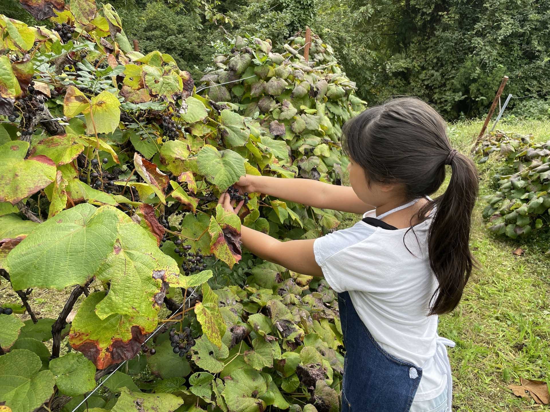 しかし最初の10年間はヤマブドウの実がならずに、試行錯誤の連続だったといいます。後にヤマブドウは一般のブドウの品種と違って、雄木と雌木の存在があることがわかりました。一般のブドウの品種は木が一本しかなくても自分自身の花粉で受精して実がなりますが、ヤマブドウの場合は雌の木の花の雌しべに、雄の木の花粉を受粉してやる必要があります。なんば農園ではかつて、人工授粉も試みたそうですが、現在はこの雄木と雌木の配置を工夫しながら自然受粉にて栽培しています。圃場を歩くと、一段高いところに並びに対して雄木を垂直に植えてあるのがわかります。しかし、雌木と雄木の花の咲く時期がずれると自然受粉がうまくいかないため、その時は人工授粉をする場合もあるとのことです。