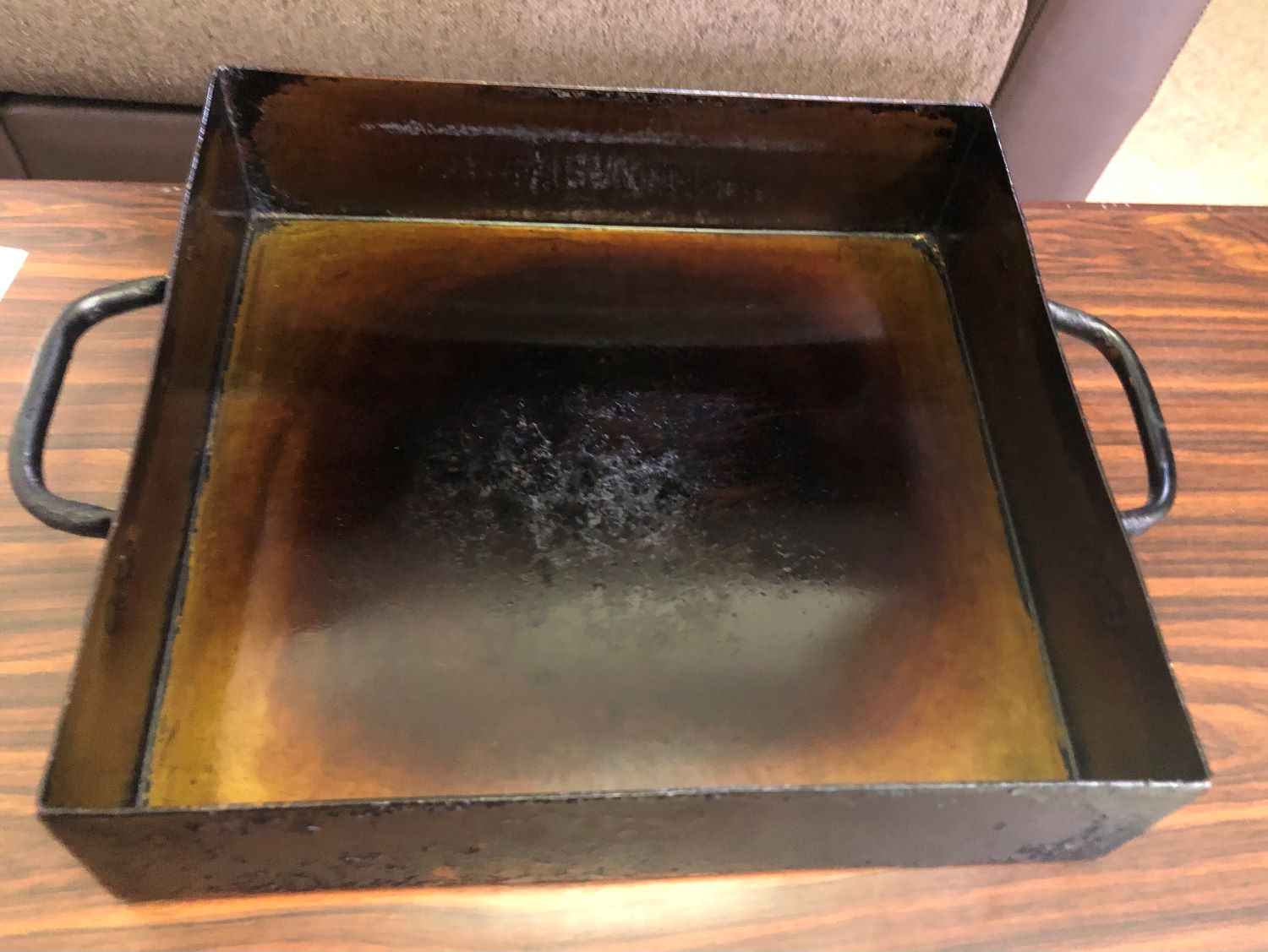 残念ながら玉子焼きに関する古い文献等は残されていません。しかし政一さんの曾祖父が作っていたことから大正時代には作られていたものと推測できます。「以前は囲炉裏の上に銅鍋、その上に銅板を置き、さらにその上に炭火を置いて5時間かけて作っていました」。そういって政一さんは今残っている銅鍋を出してくれました。この銅鍋では玉子3㎏(約60個分)で玉子焼き50切れ分を焼くことができます。