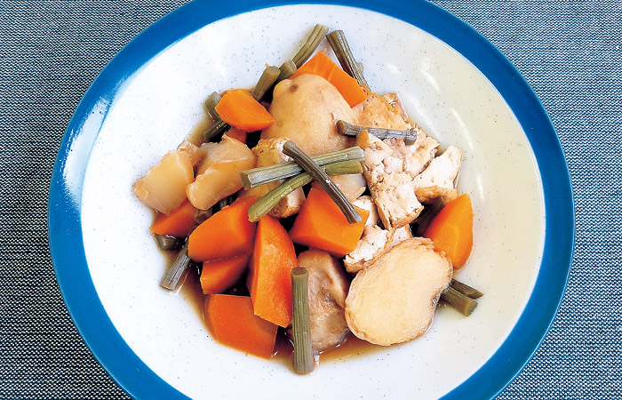 3野菜がやわらかくなったら、砂糖、醤油で味付けし、味がしみるまで煮る。
